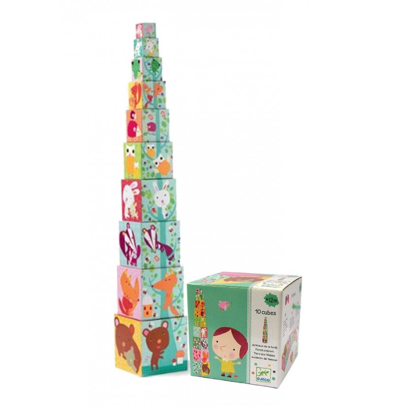 10 cubos de cartón con dibujos divertidos. Es un juego de apilar, encajar y montar puzles mientras construyes la torre. Con cada cubo de cartón practicamos 5 temas diferentes; números y cantidades, formas, tareas del día, animales salvajes y de granja.
